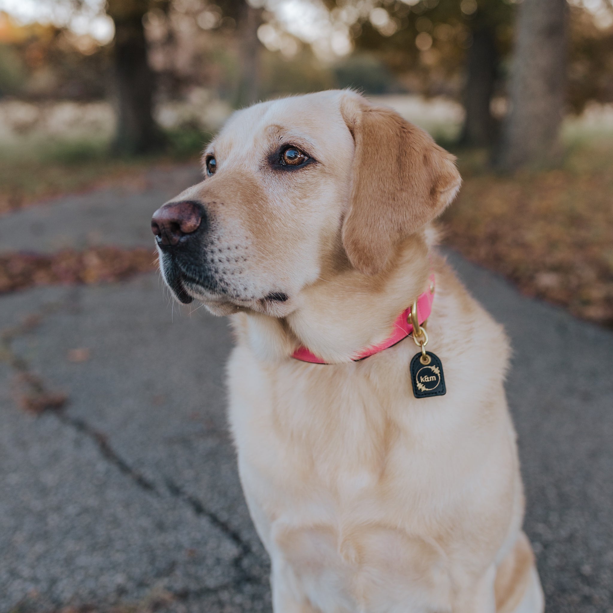 Beauty and durability have never looked so good. Each k&m collar is specially designed to have the best of both worlds. Genuine leather features combined with solid brass hardware bring an elegant style that can't be beat. Two d-rings and double layer leather offer both function and a sleek edge. Our collars are enhanced with a sliding keeper to make sure that the tail of the collar stays in place no matter what hole your dog may wear their collar on. Each collar is adorned with a FOB of our meaningful logo; a dog's "mirthful" bark.